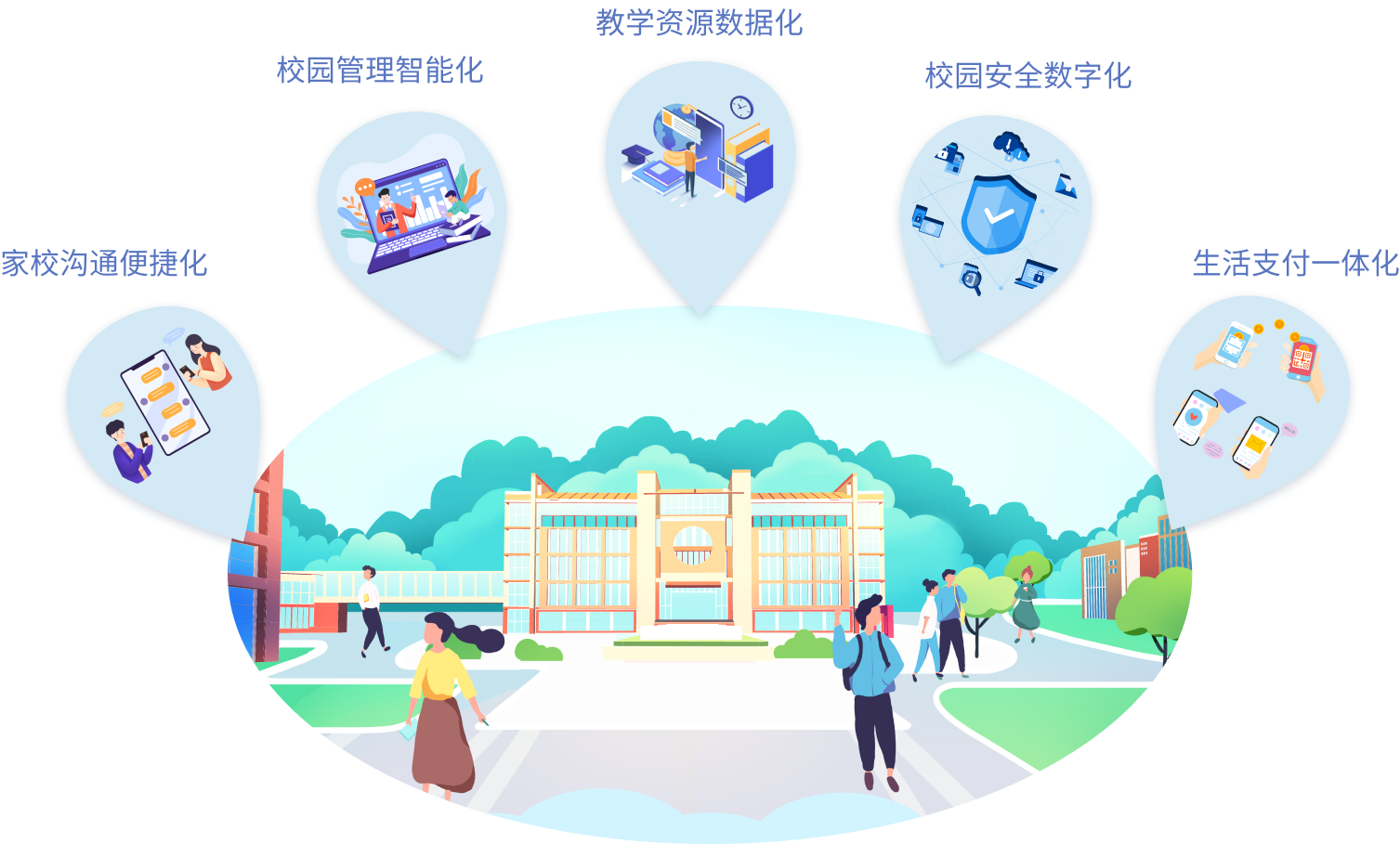 多应用整合、软硬件结合, 一站式解决家校互动、教育管理、教育资源、教育安全 、教育支付问题