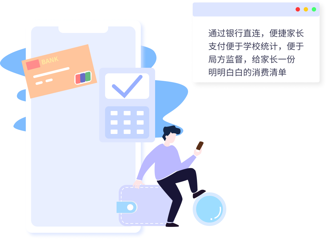 直连合作银行支付通道, 满足家长实时、便捷支付教育局、学校和家长能及时查看缴费情况报表,便于政府、教育局对所缴费用的实时监督管控。